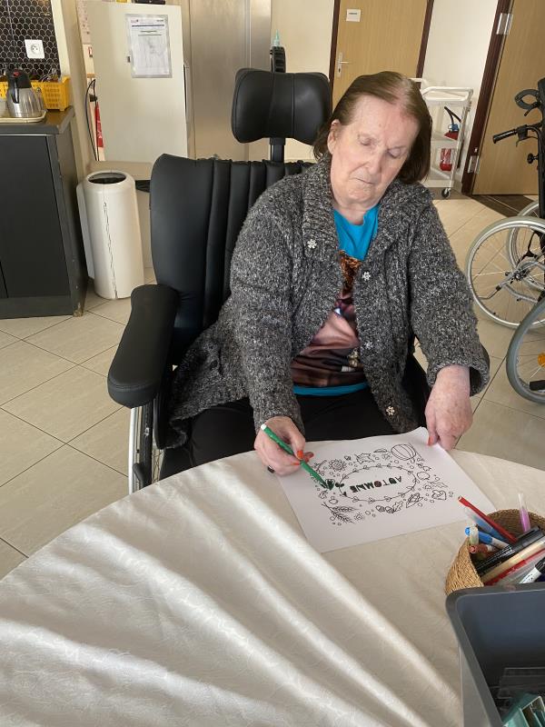 Les résidents se sont réunis dans le salon afin de faire des coloriages à l'occasion de l'arrivée de l'automne.