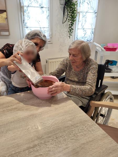 Ils se sont réunis dans le salon du rez-de-chaussée pour préparer un gâteau au chocolat tous ensemble. L’atelier s’est déroulé dans la joie et la bonne humeur.