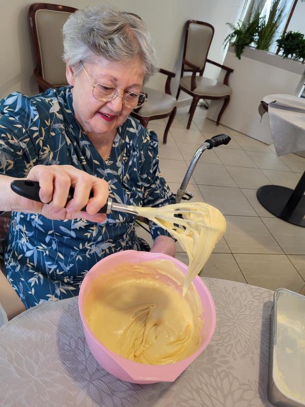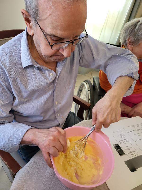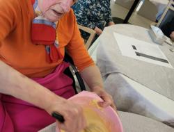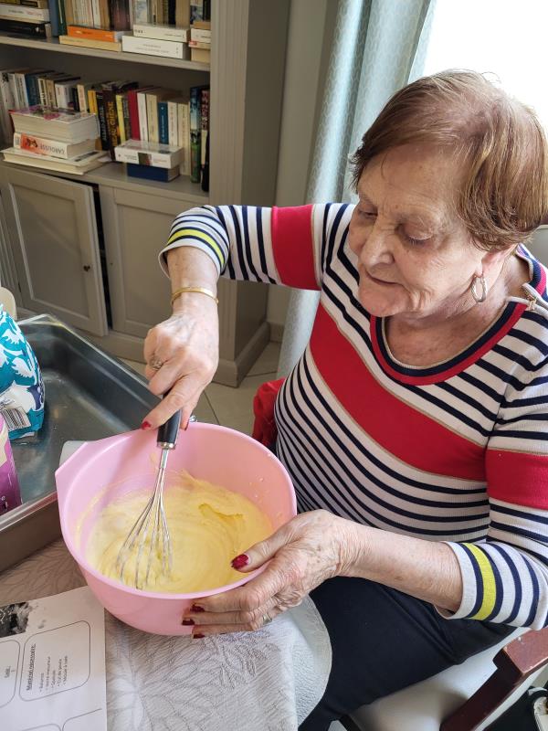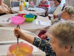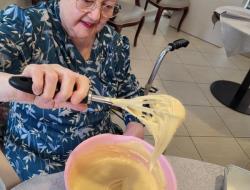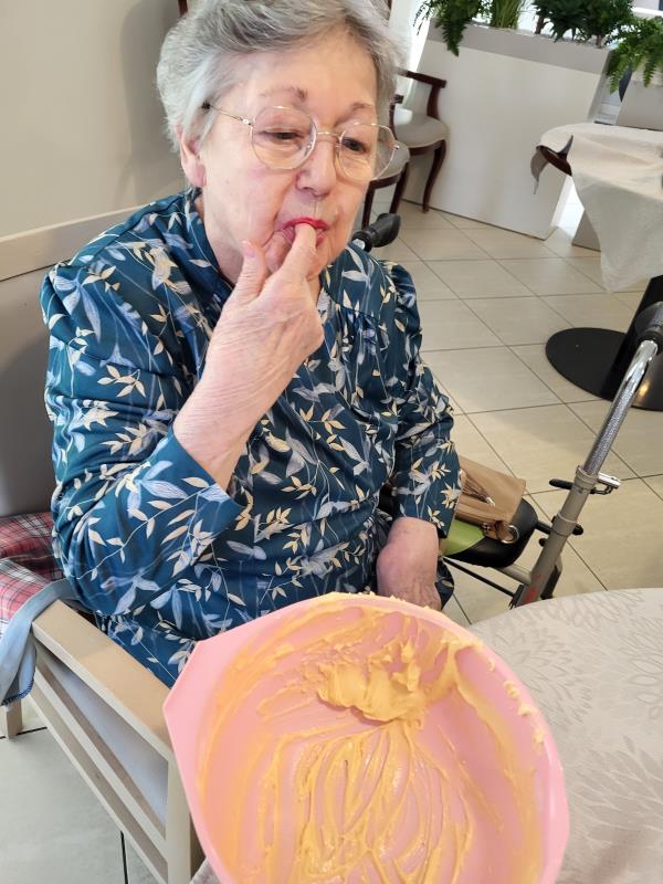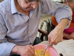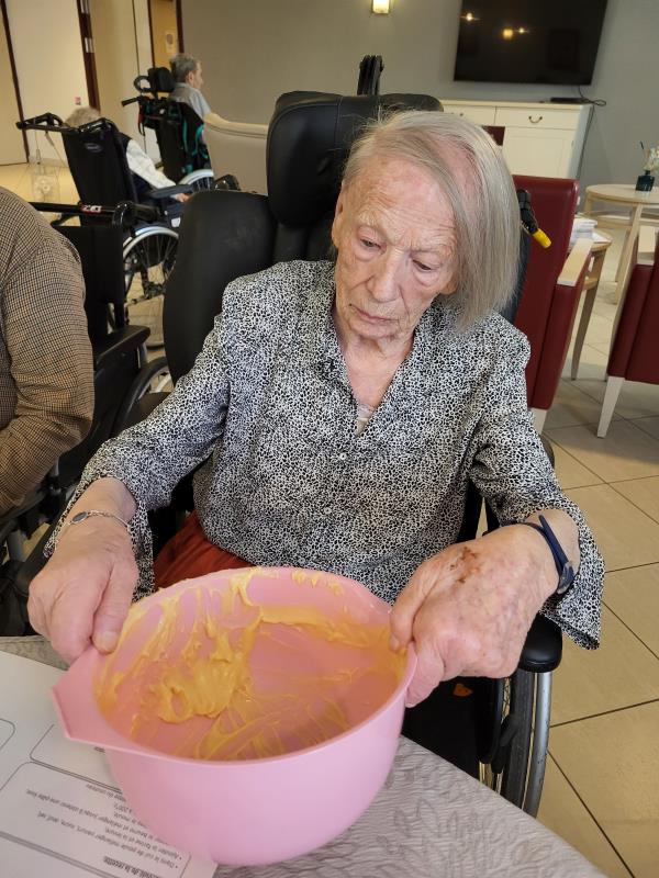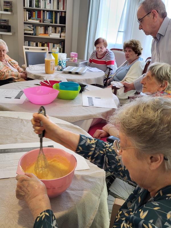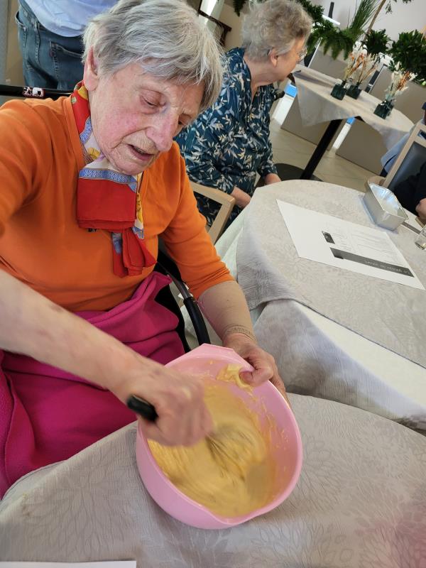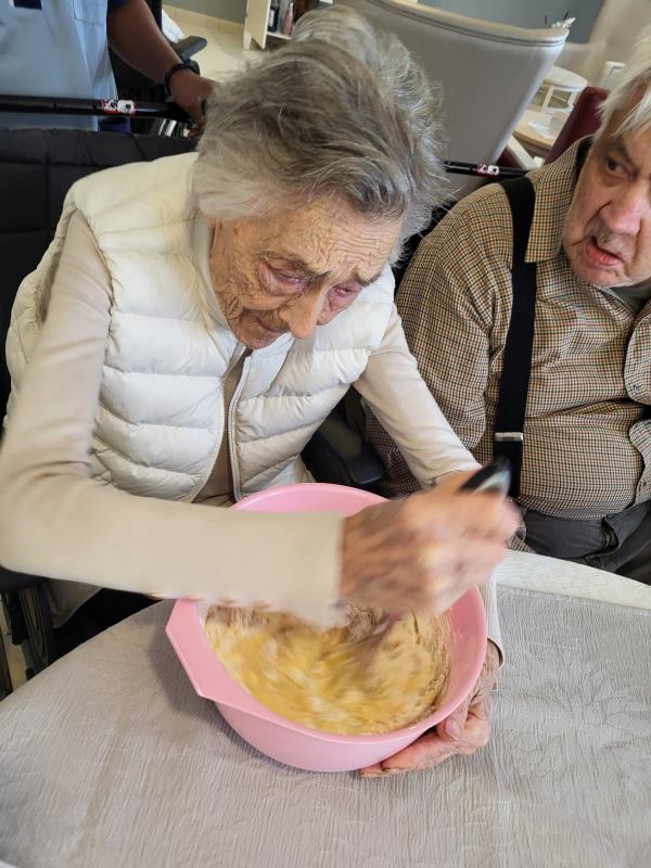 Les résidents ont participé à la préparation en mélangeant les ingrédients et en partageant leurs souvenirs liés à la cuisine.